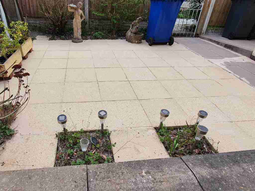 Drive and patio cleaning typically involves pressure washing to remove dirt, grime, and stains from outdoor surfaces, such as driveways, patios, and walkways.